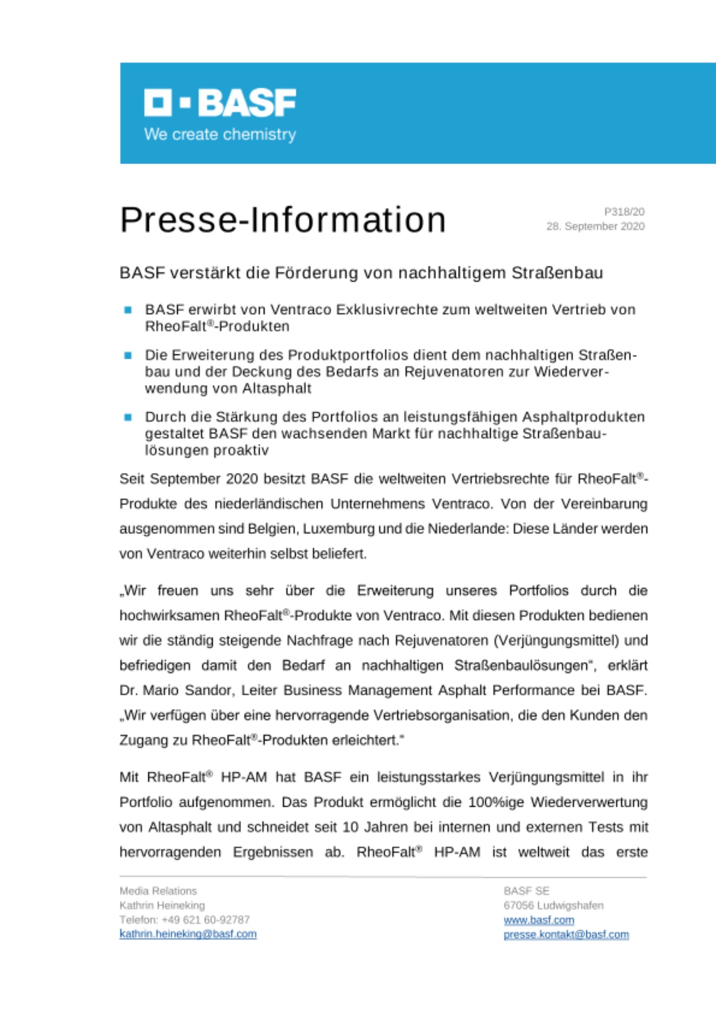 As of September 2020, BASF has the worldwide distribution rights for RheoFalt® products manufactured by the Netherlands-based company Ventraco. Excluded from the agreement are Belgium, Luxembourg and The Netherlands, where Ventraco will continue to supply the products.