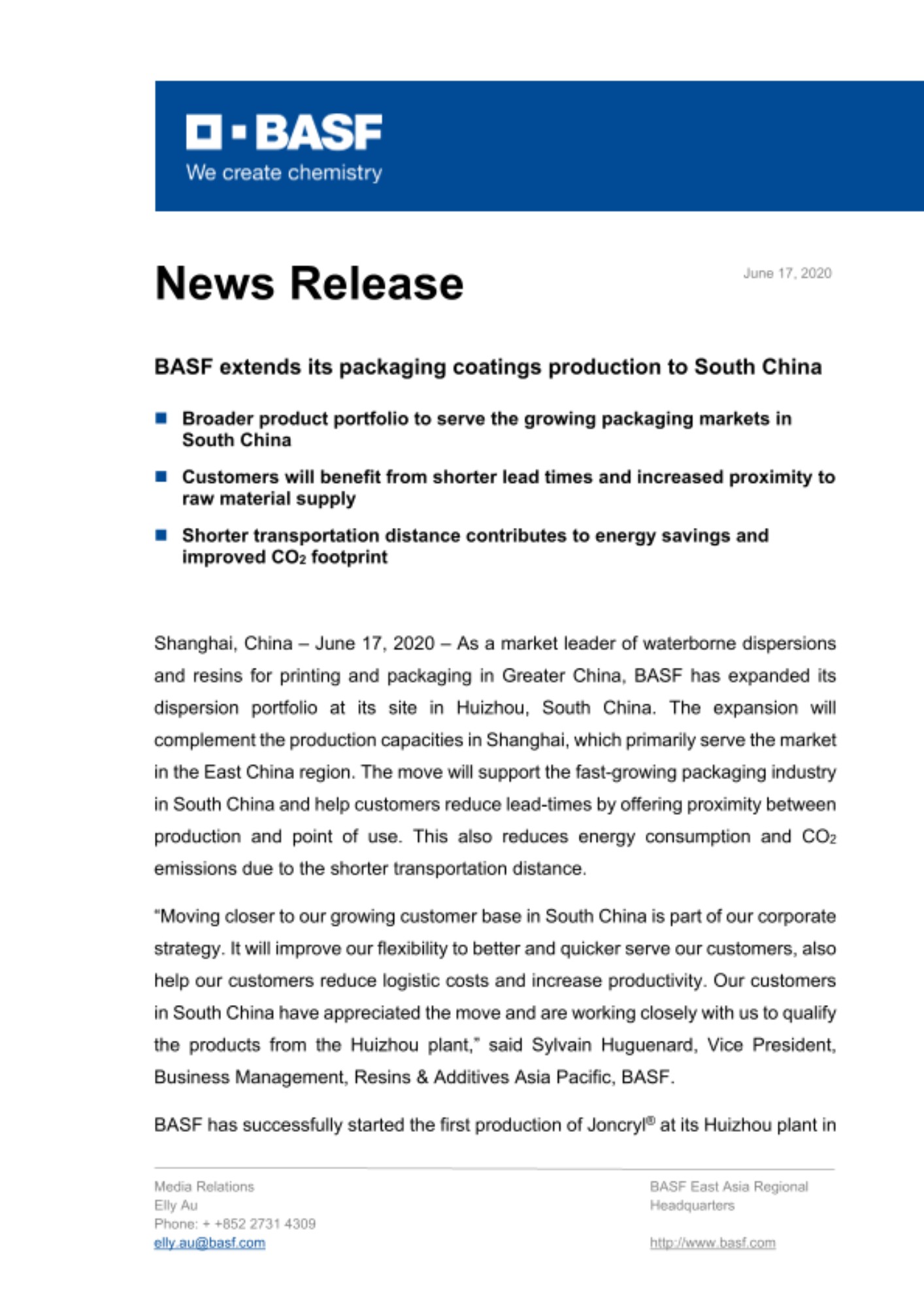 BASF has successfully started the first production of Joncryl® at its Huizhou plant in March 2020. Under the Joncryl® brand, BASF offers a broad portfolio of resins and dispersions for applications, including water-based inks, water-based varnish, functional packaging coatings and wood coatings.