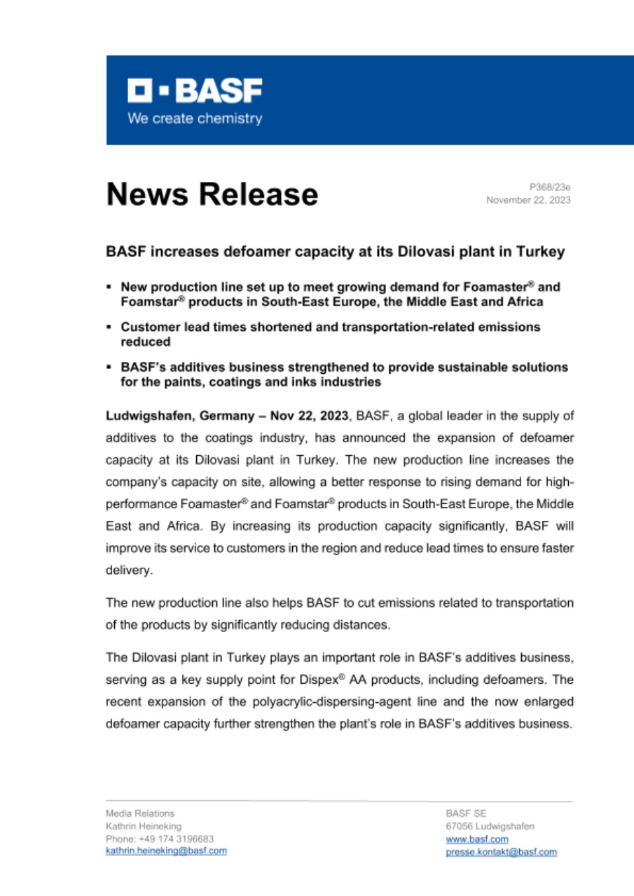 Ludwigshafen, Germany – Nov 22, 2023, BASF, a global leader in the supply of additives to the coatings industry, has announced the expansion of defoamer capacity at its Dilovasi plant in Turkey. The new production line increases the company’s capacity on site, allowing a better response to rising demand for high-performance Foamaster® and Foamstar® products in South-East Europe, the Middle East and Africa. By increasing its production capacity significantly, BASF will improve its service to customers in the region and reduce lead times to ensure faster delivery.