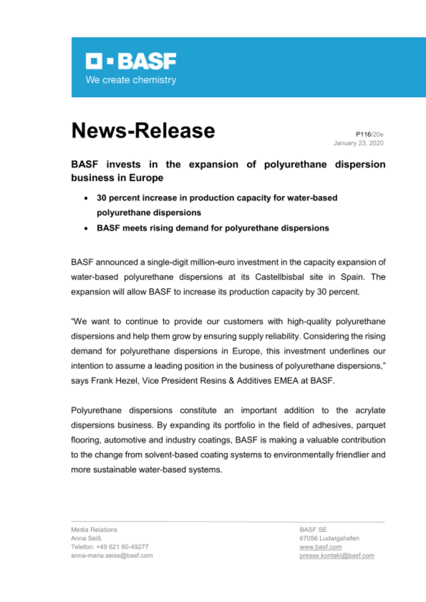BASF announced a single-digit million-euro investment in the capacity expansion of water-based polyurethane dispersions at its Castellbisbal site in Spain. The expansion will allow BASF to increase its production capacity by 30 percent.