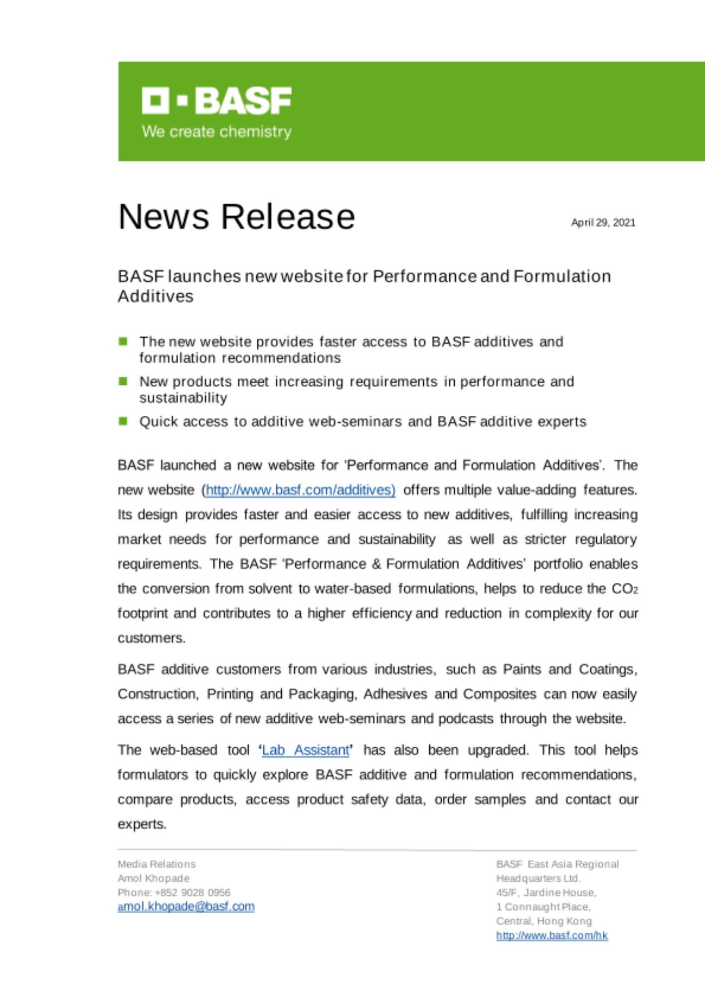 April 29, 2021 – BASF launched a new website for ‘Performance and Formulation Additives’. The new website (http://www.basf.com/additives) offers multiple value-adding features. Its design provides faster and easier access to new additives, fulfilling increasing market needs for performance and sustainability as well as stricter regulatory requirements. The BASF ‘Performance & Formulation Additives’ portfolio enables the conversion from solvent to water-based formulations, helps to reduce the CO2 footprint and contributes to a higher efficiency and reduction in complexity for our customers.