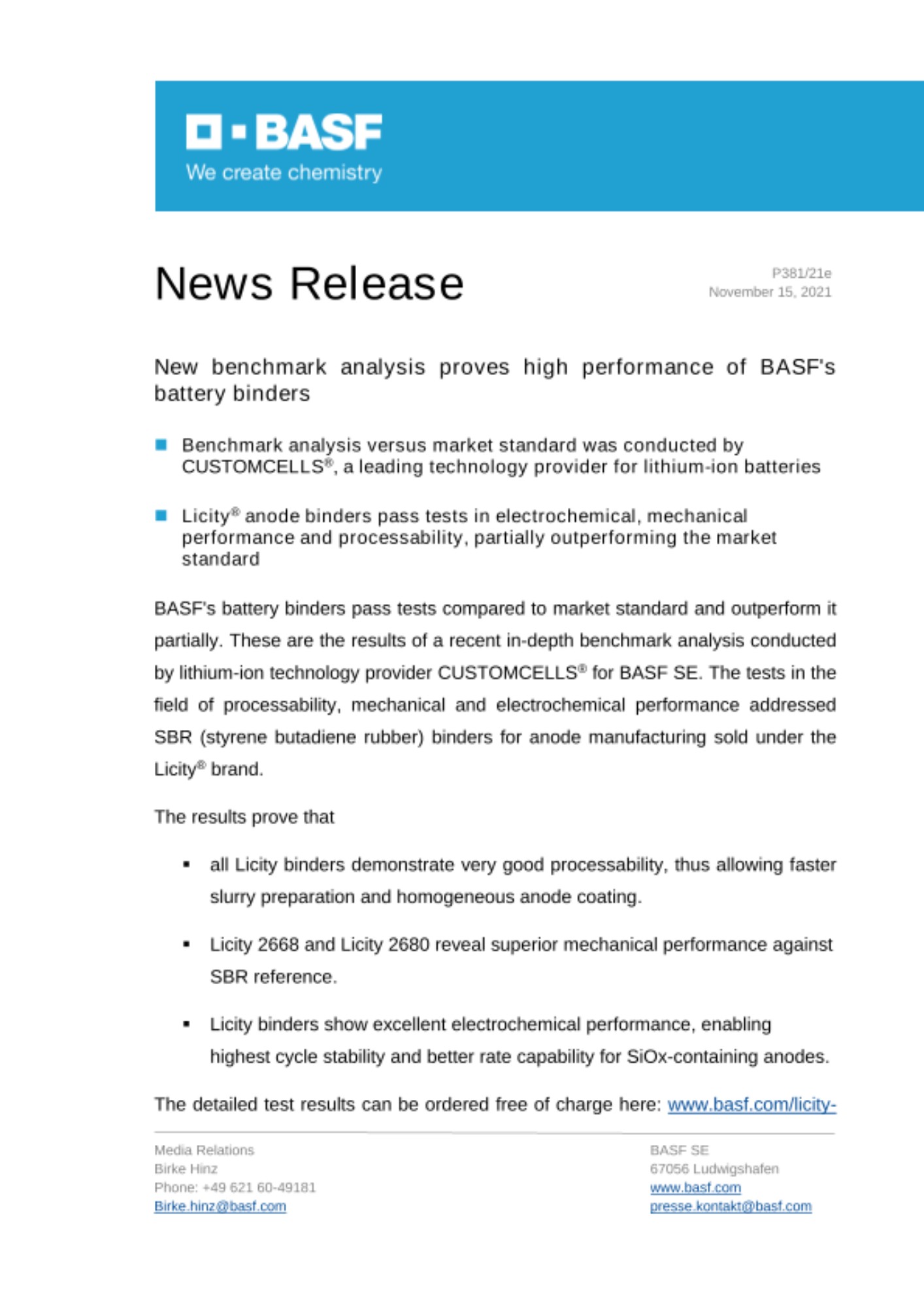 BASF's battery binders pass tests compared to market standard and outperform it partially. These are the results of a recent in-depth benchmark analysis conducted by lithium-ion technology provider CUSTOMCELLS® for BASF SE. The tests in the field of processability, mechanical and electrochemical performance addressed SBR (styrene butadiene rubber) binders for anode manufacturing sold under the Licity® brand.