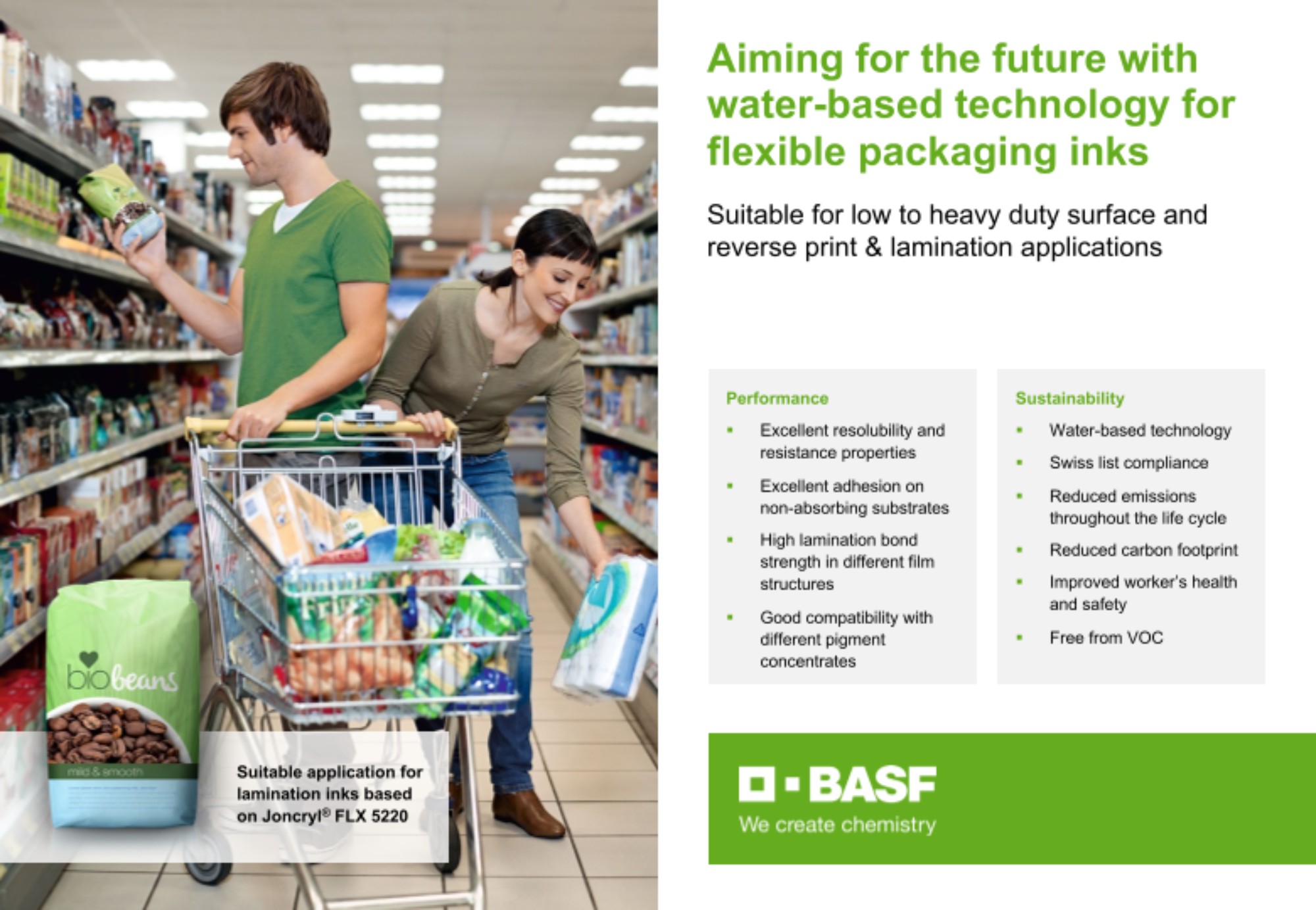| Joncryl® FLX 5060 | Excellent resolubility and high end resistance | Medium and heavy duty surface printing (PE, PP) e.g. shopping bags, fertilizer and deep-freeze bags, collation shrink film, dry food packaging, bundle wraps |