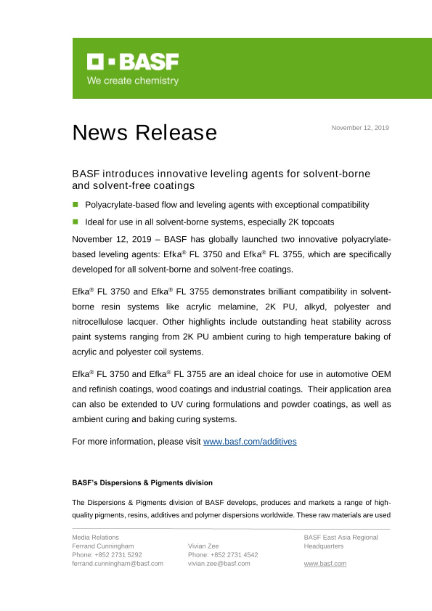 November 12, 2019 – BASF has globally launched two innovative polyacrylatebased leveling agents: Efka® FL 3750 and Efka® FL 3755, which are specifically developed for all solvent-borne and solvent-free coatings.