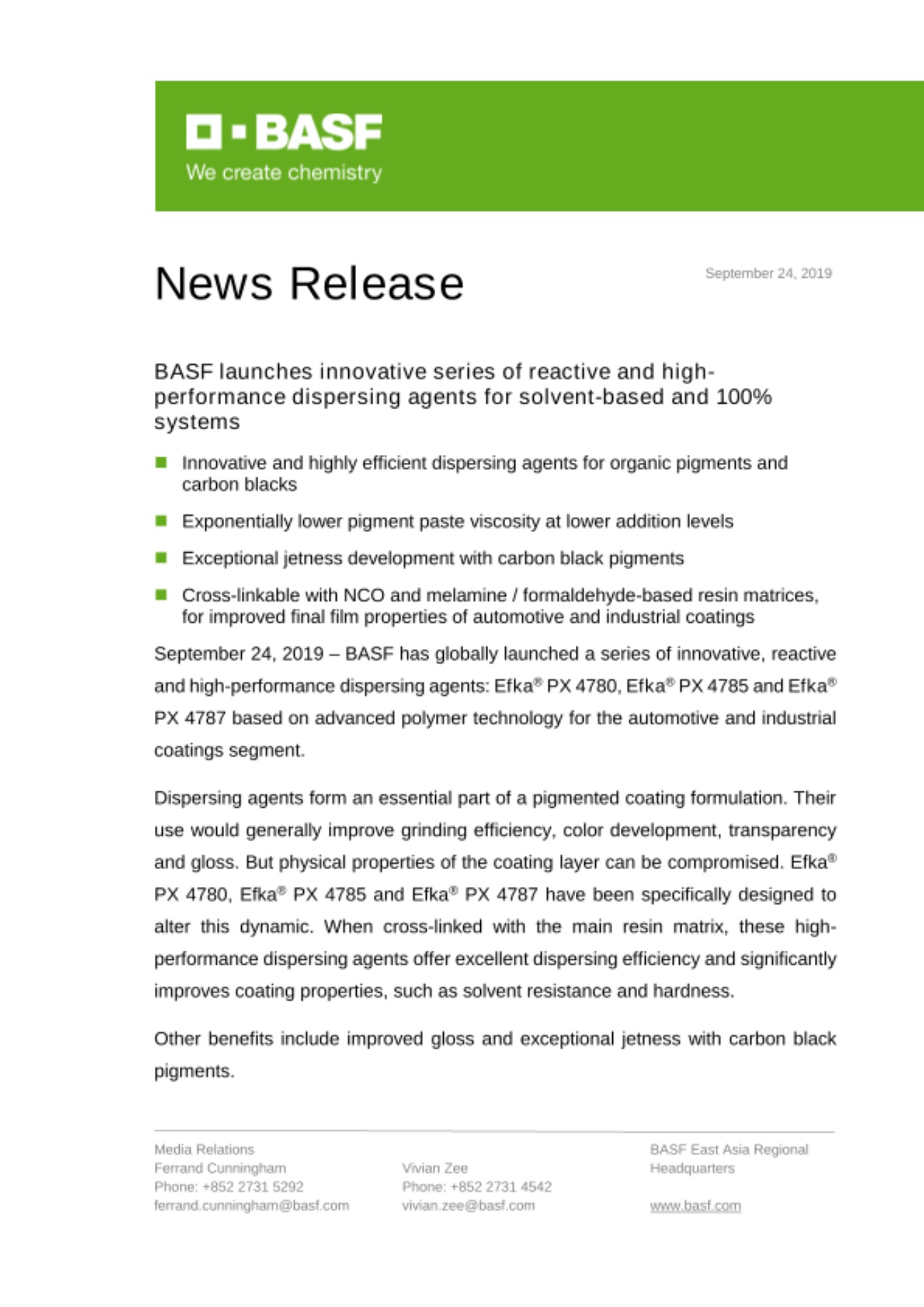 September 24, 2019 – BASF has globally launched a series of innovative, reactive and high-performance dispersing agents: Efka® PX 4780, Efka® PX 4785 and Efka® PX 4787 based on advanced polymer technology for the automotive and industrial coatings segment.