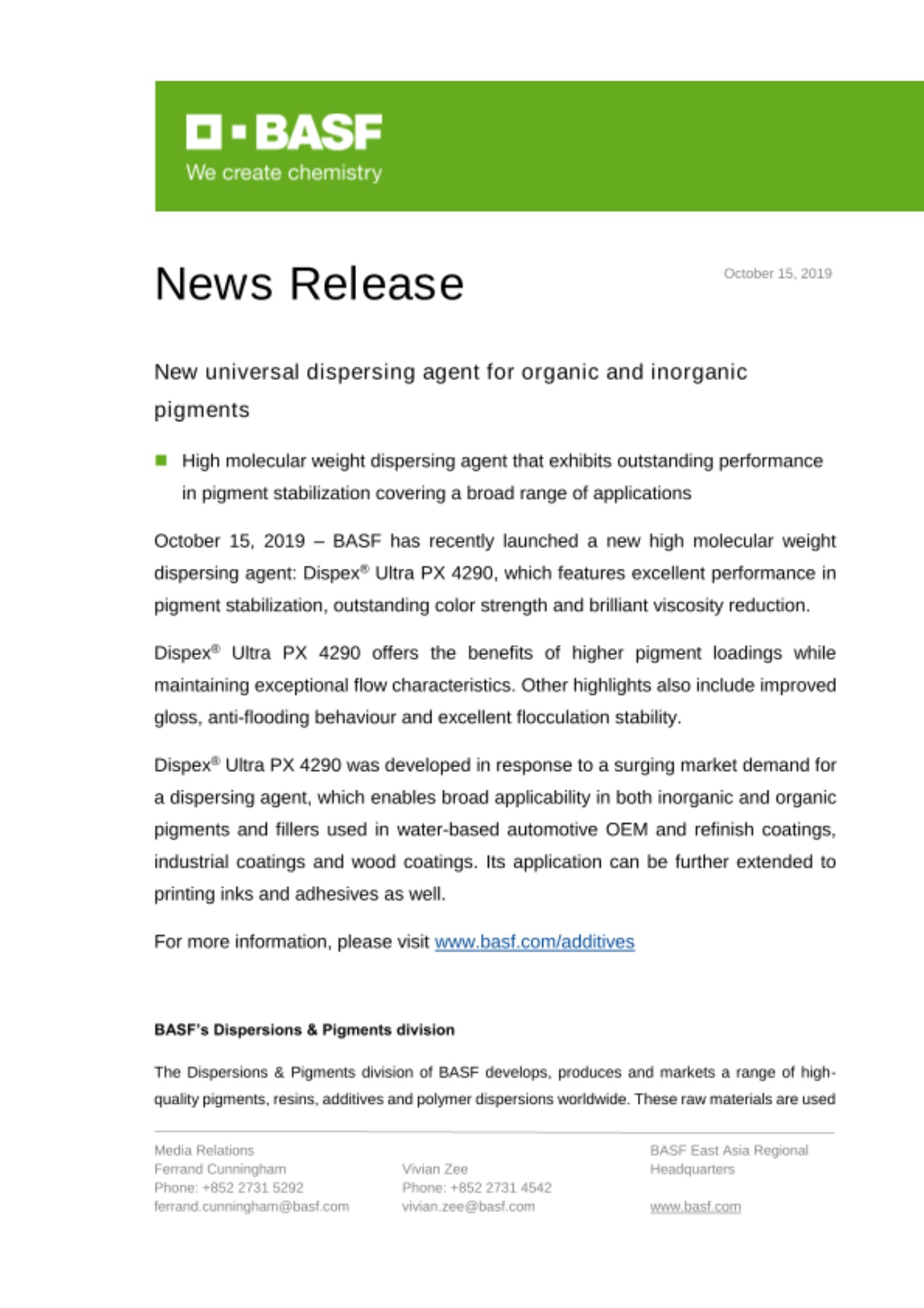 October 15, 2019 – BASF has recently launched a new high molecular weight dispersing agent: Dispex® Ultra PX 4290, which features excellent performance in pigment stabilization, outstanding color strength and brilliant viscosity reduction.