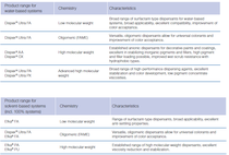 Our extensive portfolio of dispersing agents contains solutions for water-based, solventbased, high solids, 100% solids systems and universal pigment concentrates. These polymeric, oligomeric and surfactant-based technologies are known for outstanding color development, viscosity reduction, enhanced gloss and stability as well as suitability for low-VOC and APEO-free systems.
